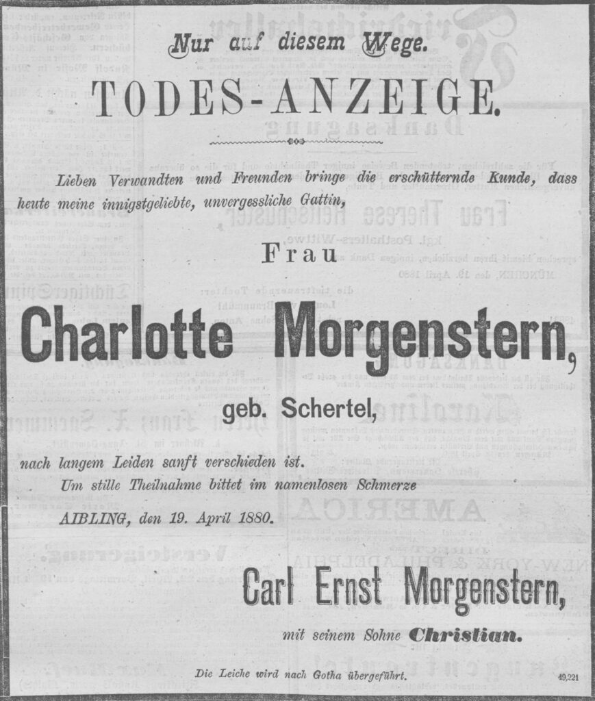 Karoline, geb. 7. Dez. 1825, gest. 29. März 1880.